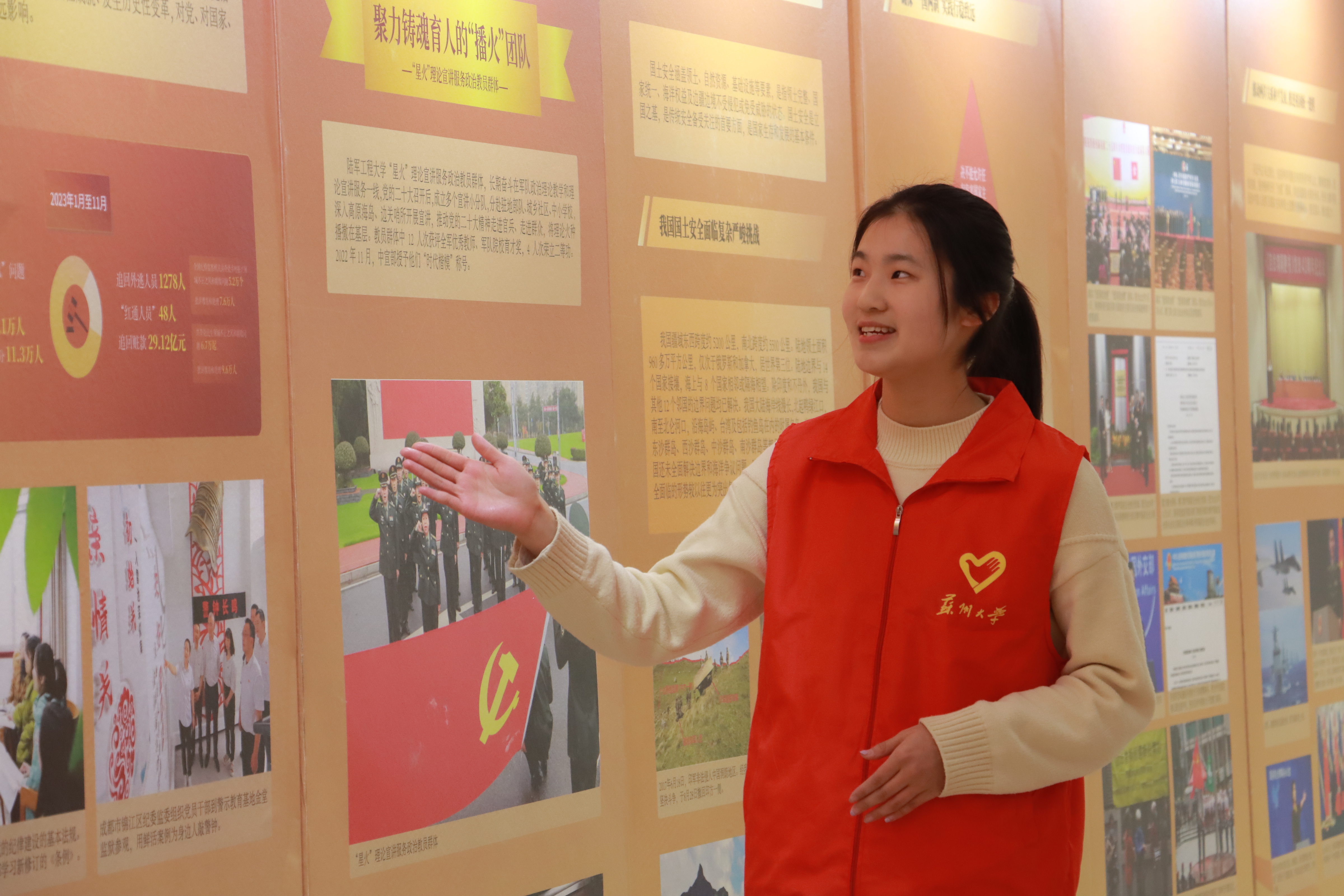 “国家安全,青春挺膺”91社区 24级本科生汤语璐作为安全教育展第一部分“推进国家安全体系和能力现代化”的讲解员,带领学长学姐们走进图书馆,原原本本地讲清楚总体国家安全观提出的背景、意义、发展脉络与内涵构成,帮助大家将总体国家安全观厚植于心。在第二部分“有效维护国家安全和社会稳定”的讲解中,党员们从一位位守护国家安全的“时代楷模”“人民卫士”“大国工匠”的故事中,进一步认识到政治安全、国土安全、军事安全、经济安全、科技安全、文化安全、社会安全、网络安全以及新型领域的国家安全的重要价值。“间谍真的离我们远吗?”怀揣好奇,党员们跟着讲解员从第三部分呈现的一组组触目惊心的数据、一张张证据确凿的图片中,了解到一个个危害国家安全的典型案例。“国家安全,一切为了人民,一切依靠人民。”在第四部分“汇聚维护国家安全合力”的讲解结束后,党员们纷纷扫描“国家安全部”官方微信公众号二维码,表示将依托阵地深化学习,从“旁观者”转为“宣传者”,讲好国家安全故事。