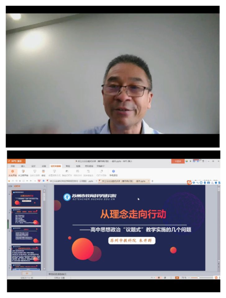 为做好本年度的教育实习工作,增进同学们对中学政治教育现状的了解,提升课堂教学能力和素养,2021年9月8日下午,江苏省中学政治特级教师、正高级教师、苏州市教科院中学政治教研员朱开群老师应邀在“腾讯会议”线上平台开展了题为“高中政治新课改背景下的‘议题式’教学”的专题讲座。讲座由哲学系副主任、思政专业负责人朱光磊教授主持,哲学系王一成老师以及2018级、2019级、2020级思想政治教育专业的同学们共同参与。
