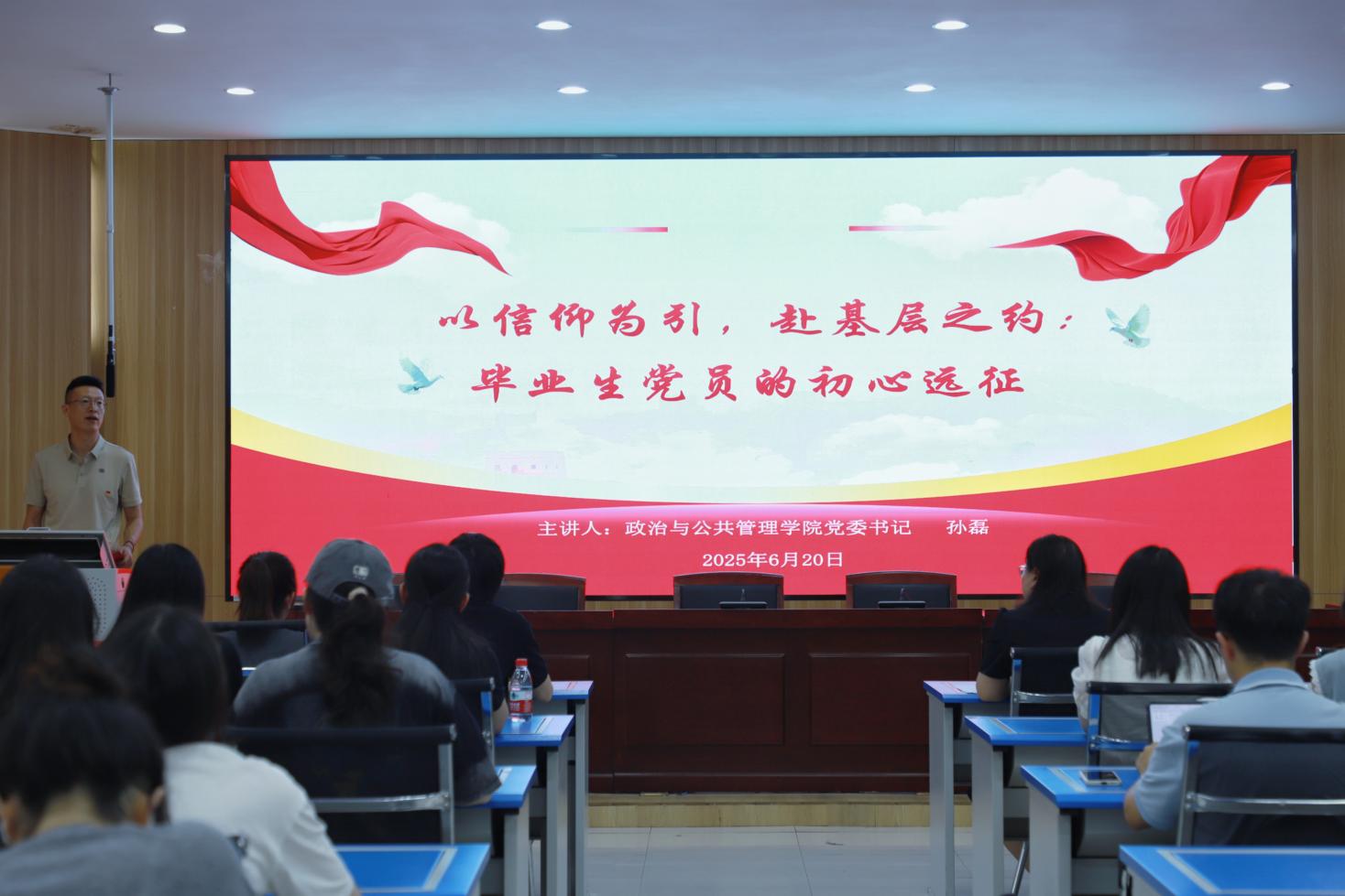 党委书记孙磊以《以信仰为引,赴基层之约》为题带来一堂微党课,他指出基层是国家治理的“神经末梢”,是毕业生党员践行初心、锤炼党性的广阔舞台,面对基层岗位的环境落差、角色转变与能力提升等挑战,勉励毕业生党员以信仰筑基、用实干赋能,牢记党员身份,严守纪律红线;深学理论,提升解决实际问题的能力;立足岗位,关心群众,在团队协作中彰显担当,永葆律己之心、进取之心、赤子之心。