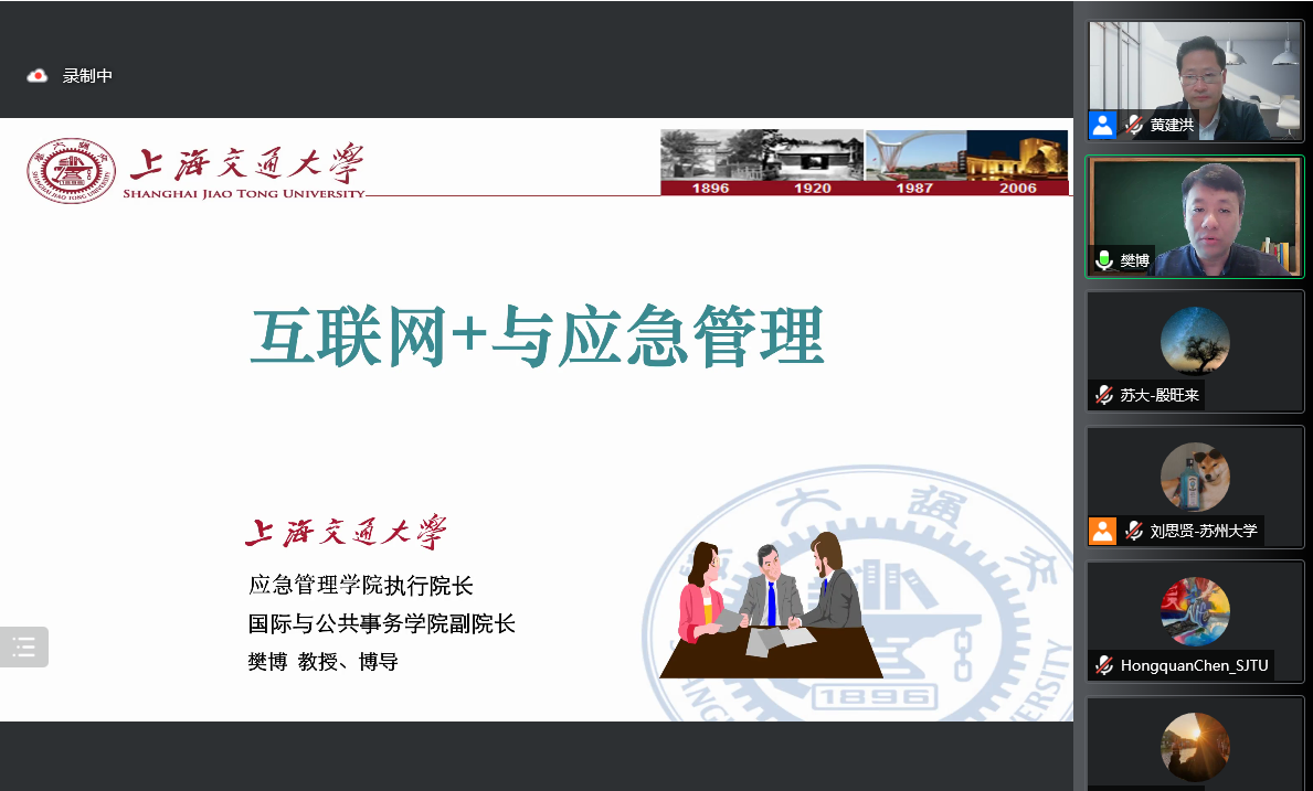 2021年11月21日下午,由91社区 主办的东吴公管系列讲座在线上召开。本期讲座邀请上海交通大学国际与公共事务学院副院长、教授、博士生导师,上海交通大学应急管理学院执行院长,教育部青年长江学者、高等学校公共管理类教学指导委员会委员樊博主讲,题目为“互联网+与应急管理”。讲座由学院副院长黄建洪教授主持,91社区 及兄弟院校近60位师生参与此次讲座。