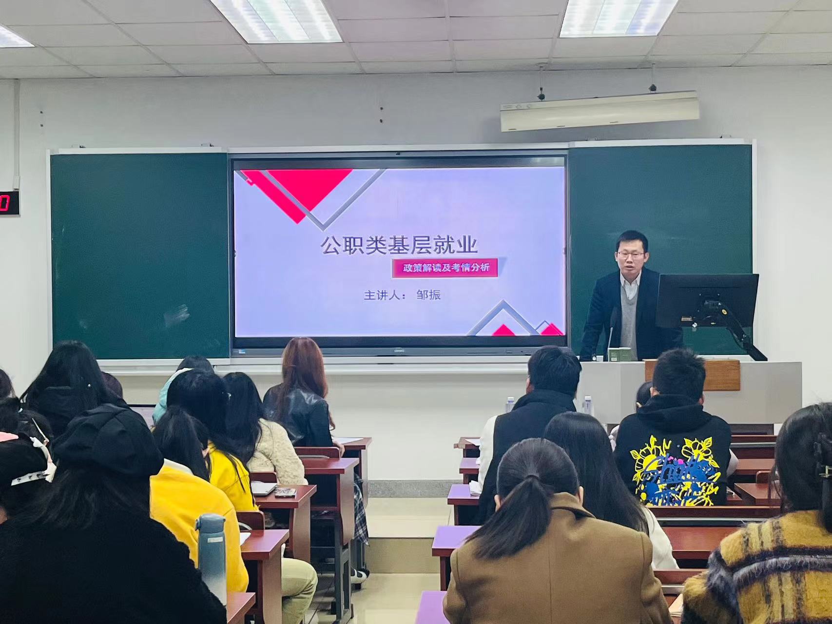 作为资深公职类考试规划师,邹振针对考试基本情况、考试内容、报考条件、发展前景等方面进行了分享与解析,让同学们更直观地了解公职类就业方向的职业特点和发展前景。他提醒同学们及早做好学习规划,做到劳逸结合,合理安排时间,认真准备。
