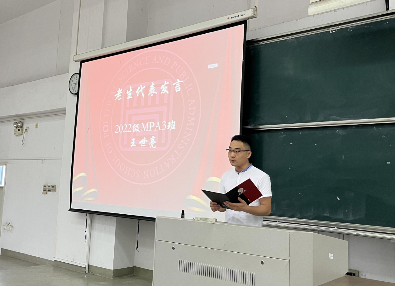 2022级王世亮同学作为老生代表为学弟学妹进行分享。他从大家喜闻乐见的热播电影开场,引出其对在职研究生就读的心得感悟:坚持理性和独特见解,坚守真诚和坦率善良,坚定初心和理想信念,令新生憬然有悟。