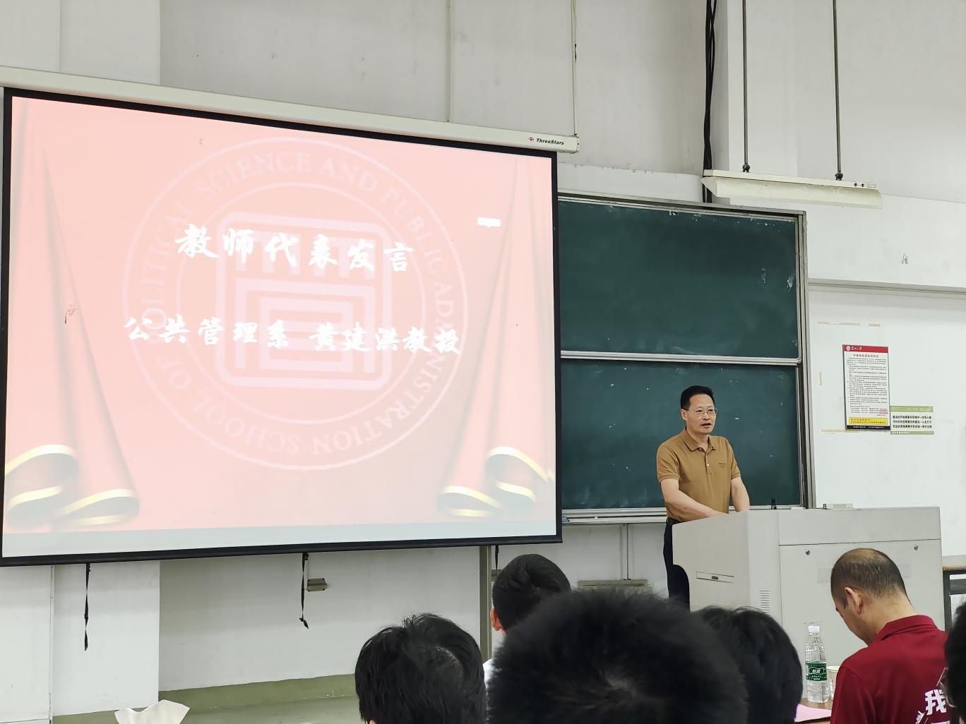 黄建洪教授作为MPA教师代表发言,他对公共管理学科进行了深入阐述,并指出公共管理旨在培养具备管理知识和实践能力的专业人才,其专业涉及面广,在当前社会发展中起着重要作用。同时也希望新生能够打造好学业、职业、家业,在学习中做到人到、心到、行动到,通过精进研究,成为对国家和社会作出贡献的研究生。