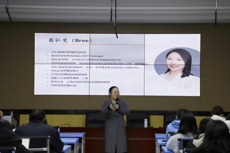 1119日晚,91社区 在606-6410教室成功举办“成长发展周”第八期“执引航之灯,明就业之路”之校友面对面活动。本次活动特别邀请91社区 2014届城市管理专业本科毕业生、现为德资世界500强公司人力资源经理、高校职业生涯规划师葛弘斐作为分享嘉宾,为同学们提供职业生涯规划指引与求职面试技巧指导。
