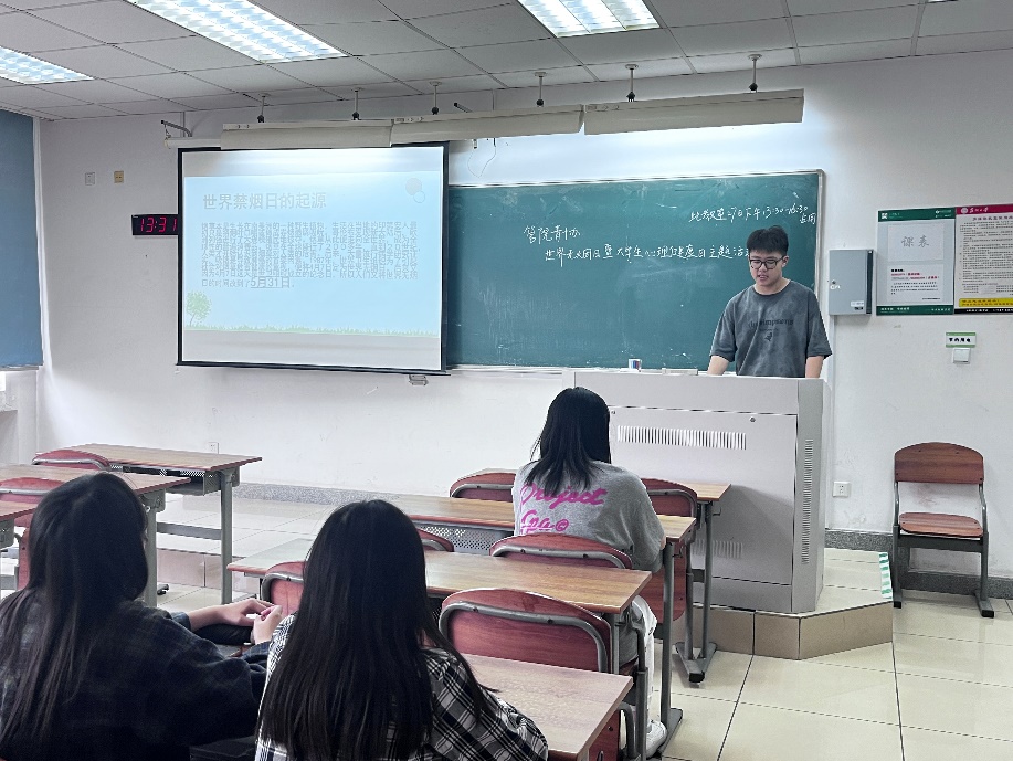 主持人对无烟日、大学生心理健康日进行了深入介绍,其生动诙谐的述说深深地吸引了台下志愿者们。各位志愿者认真倾听、积极学习,坚定了禁烟的决心,也意识到了心理健康对于大学生发展的重要性。