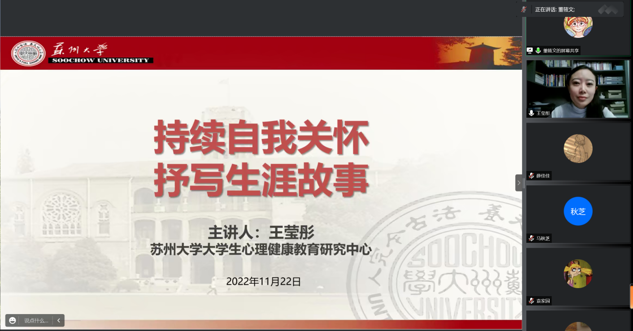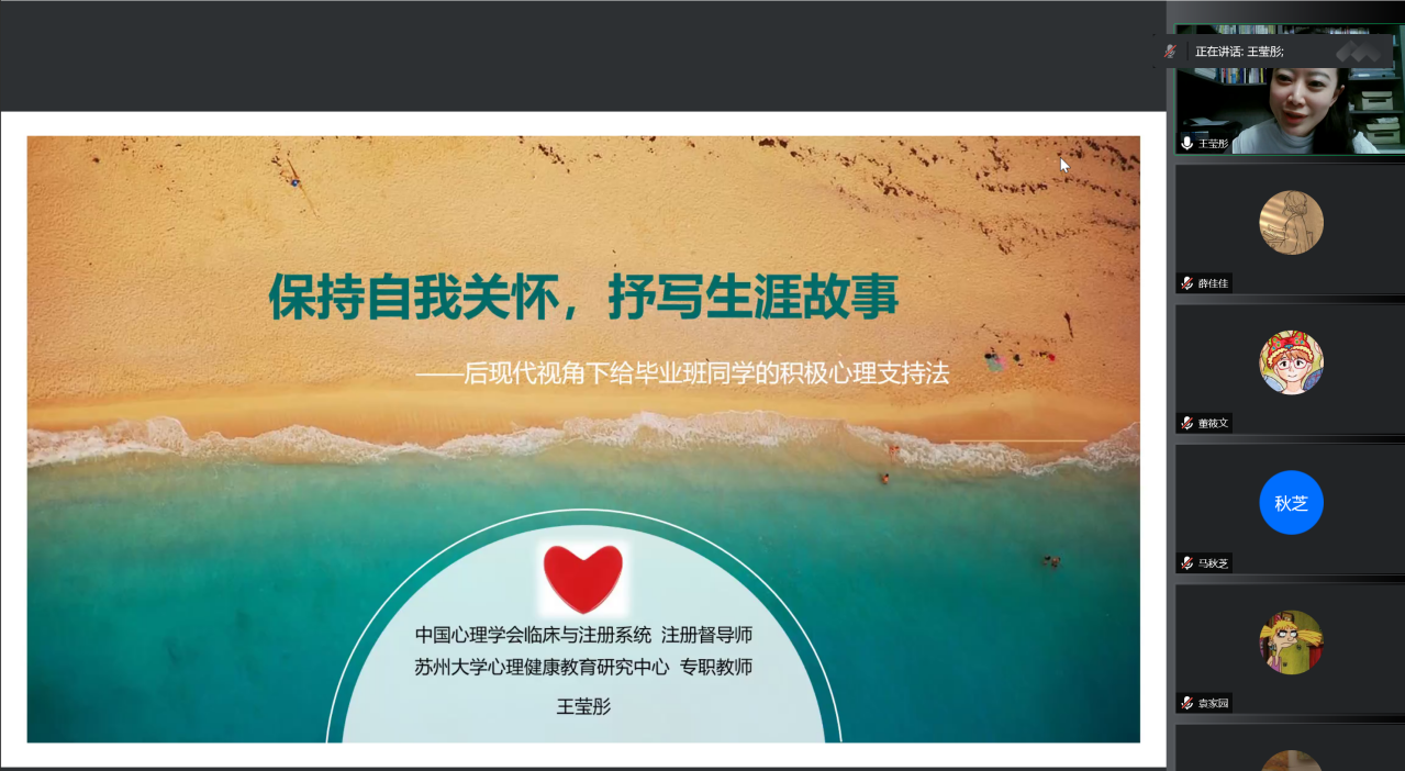 为了帮助应届毕业班同学在毕业压力前更好地认识自我,合理规划生涯,积极拥抱未来,由91社区 团委主办、院团校承办的“青春政启航,开创心未来”系列心理讲座之“持续自我关怀,书写生涯故事”于11月23日16时以线上会议的形式展开。本次活动由中国心理学临床与注册系统注册督导师、91社区 心理健康教育研究中心专职教师王莹彤老师作为主讲嘉宾,由91社区 本科生辅导员薛佳佳老师主持。此外,19级本科生参与了本次主题讲座。