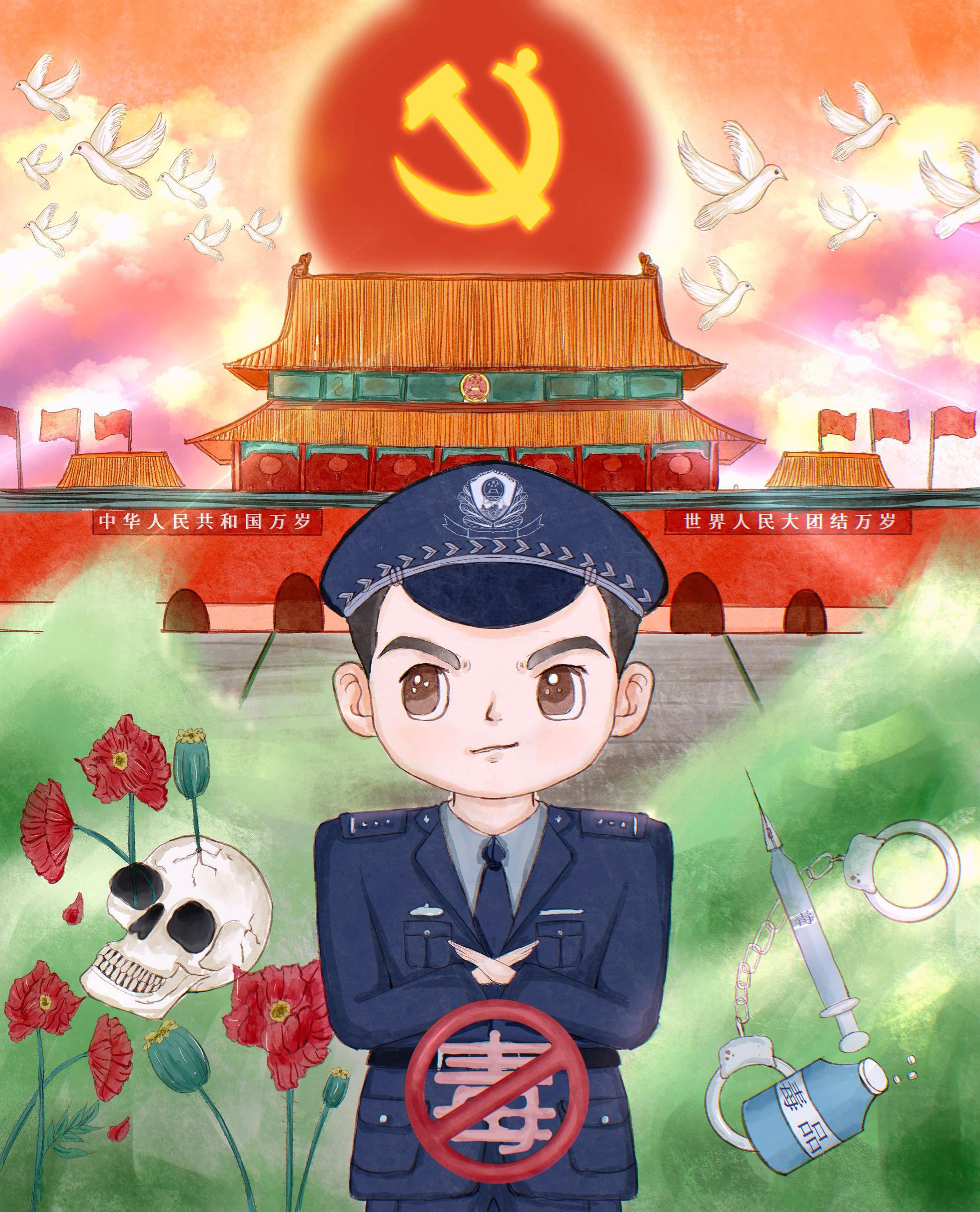 另一幅作品中,一位缉毒警察目光坚定地作出禁毒手势,画面两侧则点明了毒品服用的痛苦和后果,给人以巨大的震慑力。而画面上方的党徽和和平鸽象征着幸福、平安、和谐的生活的背后是一位位无名英雄默默无闻的付出。整幅画面充足而不凌乱,主题鲜明、贴切、丰富。