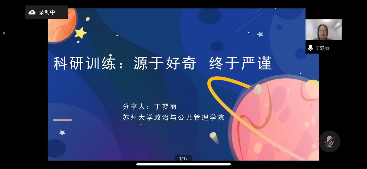 3月28日晚,丁梦丽老师开展题为《科研训练:源于好奇,终于严谨》的主题发言。丁老师围绕好奇与严谨这两个关键词,深入浅出地向21级新生介绍了科研这条大学的必由之路该如何走好。发现问题是科研的开端,也是科研的难点。丁老师通过自身案例,用心存善意、阅读文献、保留自我可塑性这三种方法启发同学们培养问题意识。在涉及严谨这一关键词时,丁老师从厘清理论与实践的关系,学习研究方法的角度出发,强调了科研过程中要遵循学术规范,并以自己的科研经历让同学们明白科研要耐得住反复修改的考验。在论坛最后,丁老师还分享疫情期间线上学习的小技巧,帮助同学们提升网课学习质量。