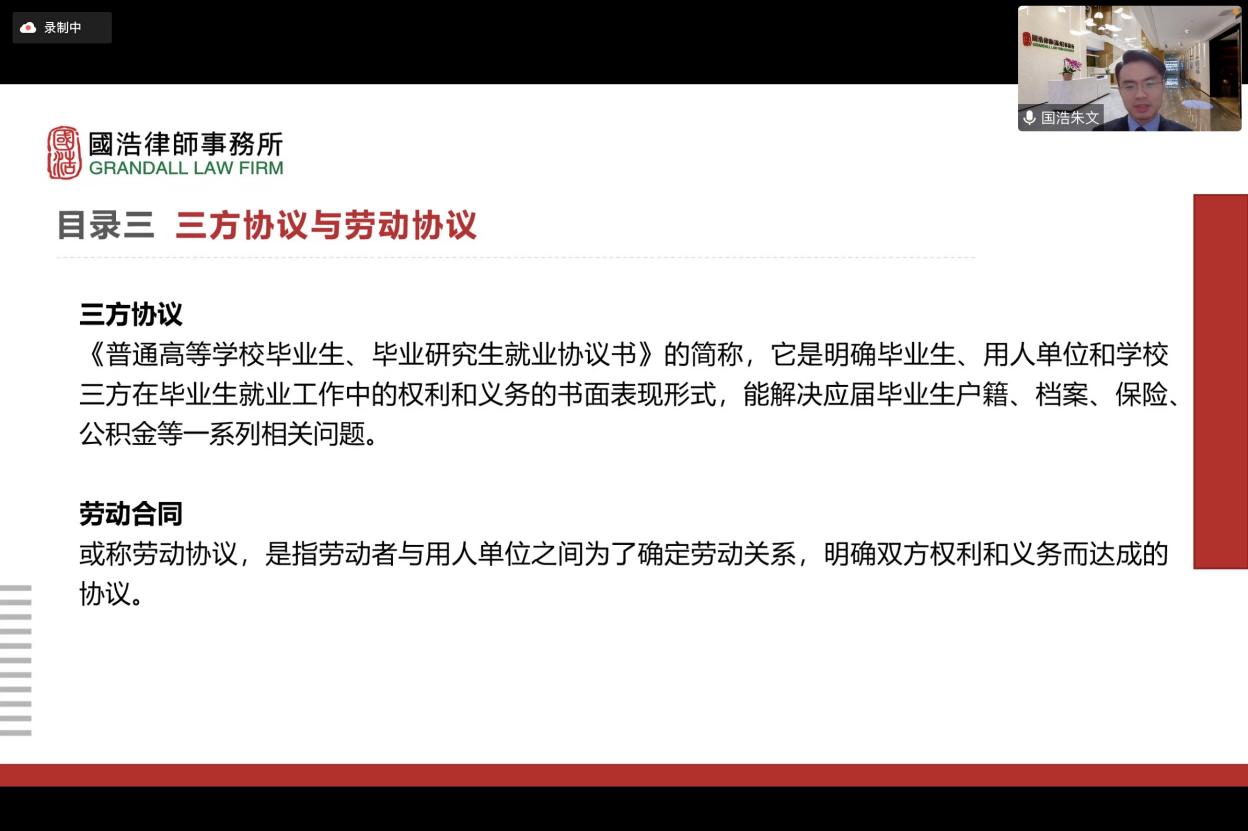 全情陪伴,服务护航。为进一步增强法律安全教育,提升就业质量,4月7日晚,职业发展活动周之“毕业与就业,法意与人情”就业签约专题指导会在腾讯会议上成功举办。本次活动特邀国浩律师(苏州)事务所律师、91社区