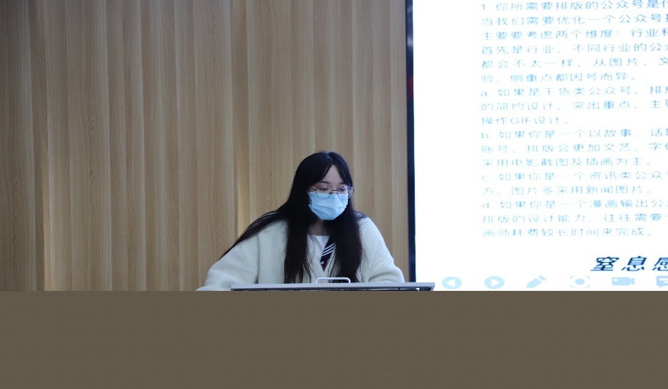 唐艺菡以“如何做出好看的推送”为主题,向同学们分享了推送制作软件的使用方法和如何把推送做得赏心悦目的思路。她着重介绍了如何将推送做到结构布局合理、色彩搭配协调的方法。她说到好的模板和协调的色彩搭配可以增加推送画面的美感,并向同学们推荐了几个模板素材及色彩搭配的网站。最后唐艺菡鼓励同学们推送制作的进步周期很长,需要同学们放平心态,慢慢摸索,不轻易言弃。