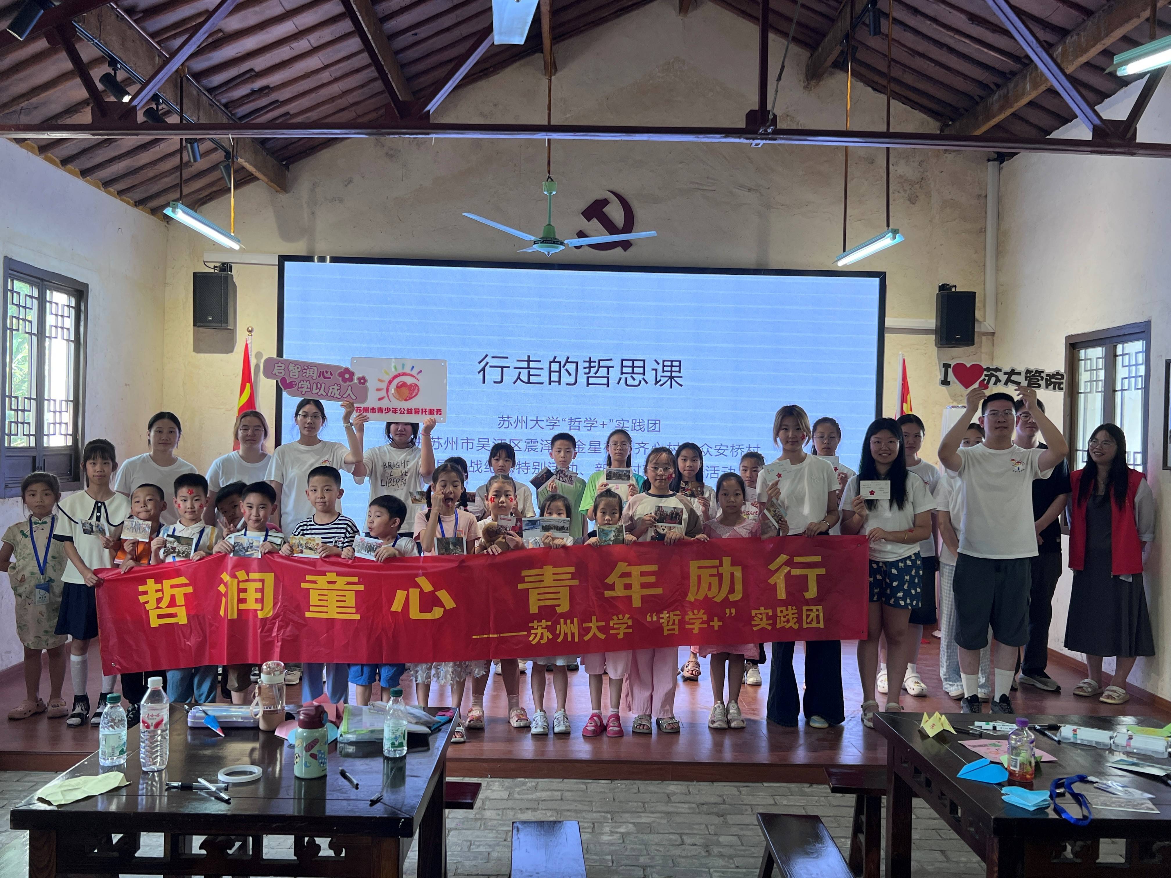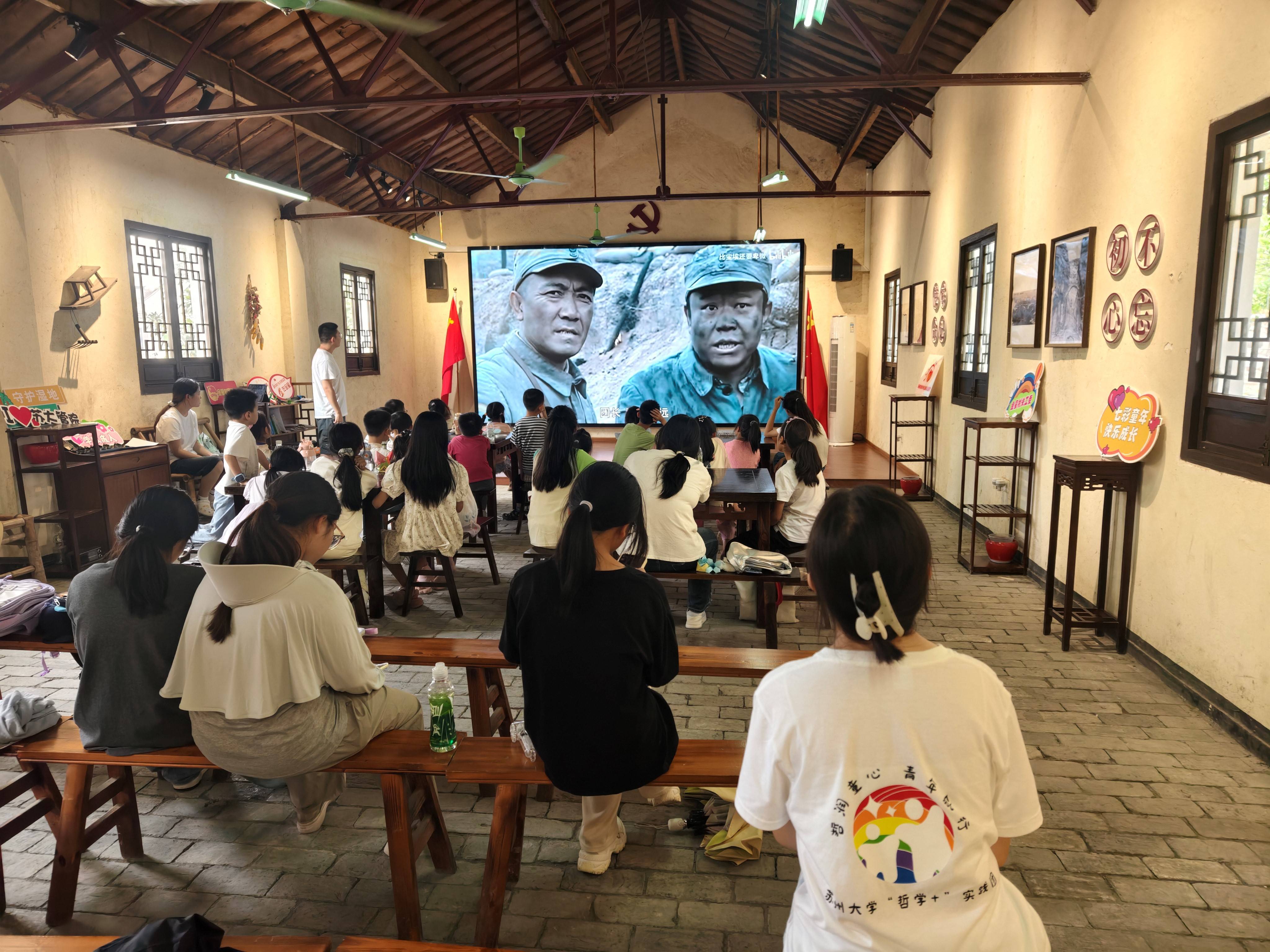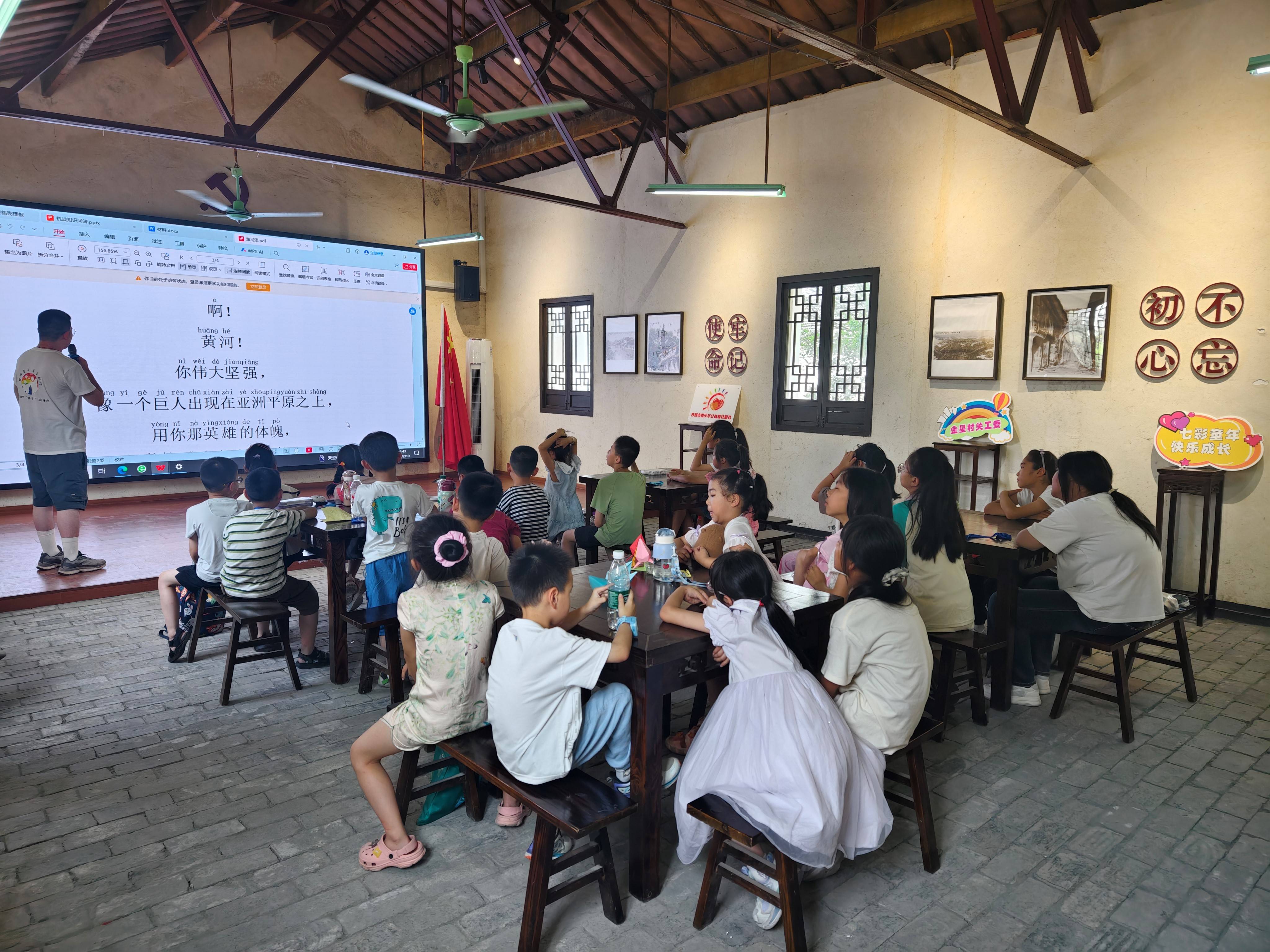 为纪念抗日战争胜利80周年,厚植青少年家国情怀,赓续红色文化血脉,7月16日上午,金星村、齐心村、众安桥村联合91社区 "哲学+"实践团,以"行走的哲思课"形式开展抗战主题教育实践活动。通过"诵读经典+光影思辨+艺术创想"三维课堂,将抗战精神转化为可触摸、可感知、可传承的生命体验,为乡村振兴注入"强国有我"的青春动能。