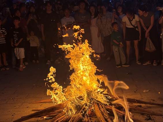 在祥云,火把节的热闹从下午就开始了。街上搭起了彩门,卖小吃的摊位排成一条街,油炸的香味和烤肉的香气混在一起。晚上八点,广场中央的篝火点燃,火光闪亮,把人们的脸映得红红的。当地人将火把递给团队的青年们,木柄在手里很沉,火焰在耳边劈啪作响。鼓声一响,人群舞动起来。团队成员与阿婆、本地老师、其他志愿者手牵得愈发得紧,笑声混着火苗的噼啪声,在夜色里飘荡得很远。热浪从脚底一直涌到额头,衣服上沾了烟火味。回到住处时,橙色的火光还在心中,越燃越旺。