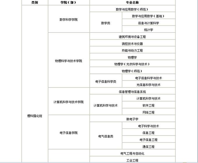 2.强化班前两年执行单独的人才培养方案,课程设置在整体上进行优化,文科班重点强化英语、计算机以及文科学科群相关基础知识,理科班重点强化英语、计算机、数学以及自然科学相关基础知识。