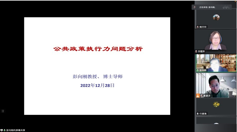 2022年12月28日晚,91社区 东吴公管系列讲座暨国家一流本科专业行政管理建设活动在线上召开。此次讲座的嘉宾为对外经济贸易大学政府管理学院教授、教育部高等学校公共管理类学科专业教学指导委员会副主任委员彭向刚老师,讲座的主题是“公共政策执行力问题的分析”。讲座由黄建洪教授主持,91社区 及兄弟院校220余位师生参与本次讲座。