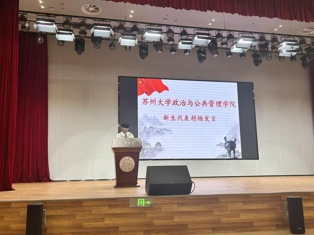 随后,新生代表胡杨同学登台发言,不仅彰显出成为苏大学子的骄傲, 更传递出对校园生活的热切期盼、对师长的诚挚敬意,以及在学业路上全力以赴的决心,引发了在场新生的强烈共鸣。